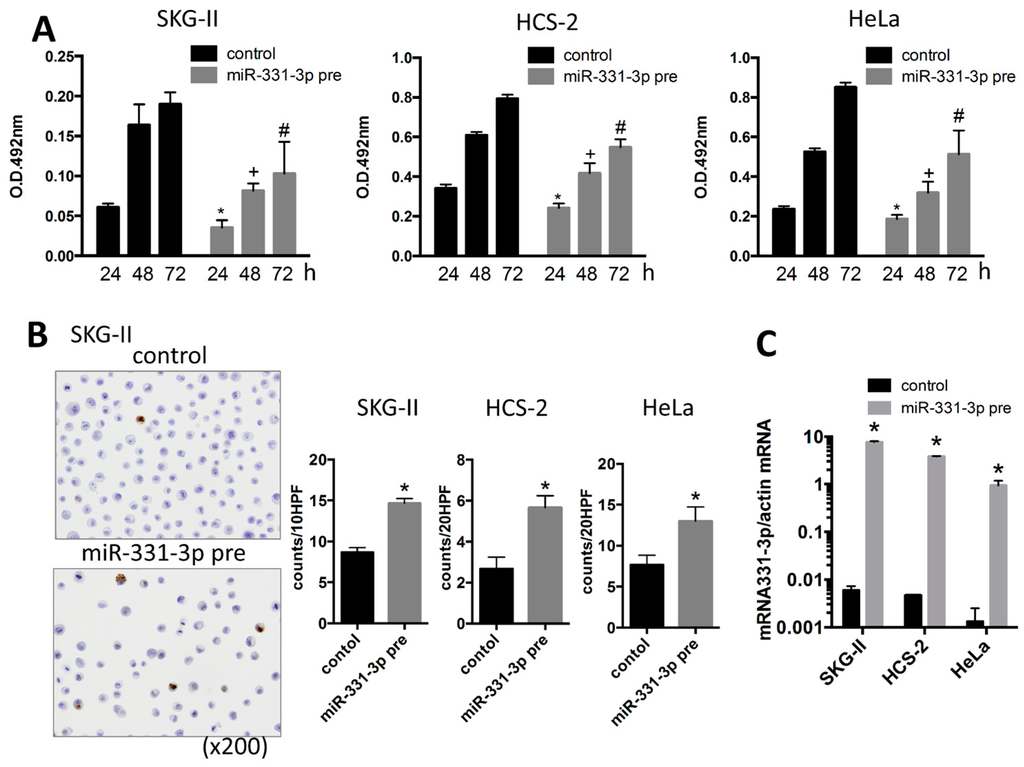 Cell proliferation and apoptosis assay in the cervical cancer cells. (A) MTS assay in SKG-II, HCS-2 and HeLa cells. Cell proliferation was suppressed by transient transfection of the miR-331-3p precursor. (pre: precursor, * p < 0.05 (24 h), + p < 0.05 (48 h), # p < 0.05 (72 h)); (B) TdT-mediated dUTP nick end labeling (TUNEL) assay for SKG-II, HCS-2 and HeLa cells. The Y-axis shows the number of positive cell counts per 10 or 20 high-power fields (10 or 20 HPFs). Positive cells were induced by transfection of the miR-331-3p precursor (* p < 0.05); (C) Expression of miR-331-3p was up-regulated in SKG-II, HCS-2 and HeLa cells by miR-331-3p precursor transfection compared to control cells (* p < 0.05).