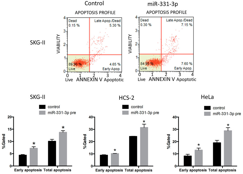 Annexin V assay for cervical cancer cells. Early and total apoptotic cells were significantly increased by miR-331-3p overexpression in SKG-II, HCS-2 and HeLa cells (* p < 0.05).