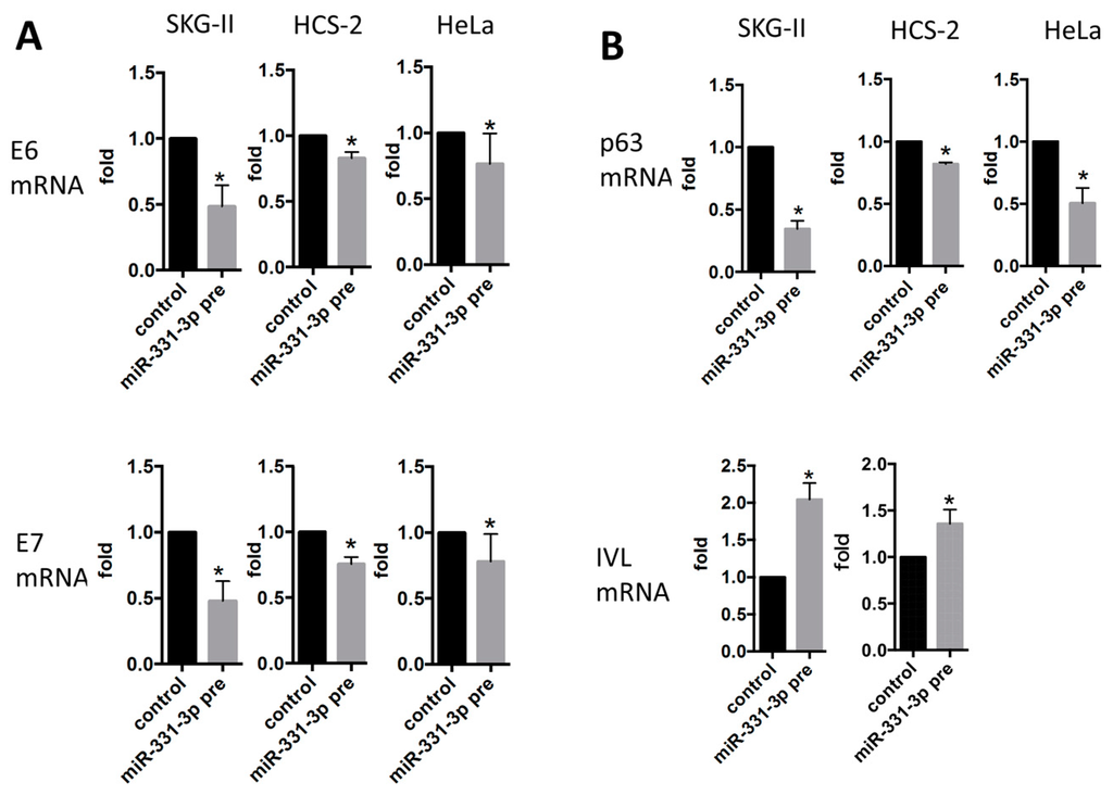 mRNA expression of HPV-related oncogenes, E6/E7 and keratinocyte related genes, p63 and IVL. E6/E7 (A) p63 and IVL (B) mRNA expression in SKG-II, HCS-2 and HeLa cells. The Y-axis (fold) shows relative expression compared with control (normalized with actin mRNA expression). E6/E7 and p63 mRNA expression was significantly decreased in SKG-II, HCS-2 and HeLa cells transiently transfected with miR-331-3p precursor, whereas IVL mRNA was significantly increased in SKG-II, HCS-2 and HeLa cells transiently transfected with the miR-331-3p precursor (* p < 0.05).