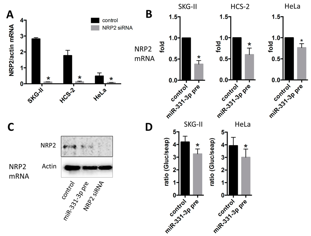 mRNA expression of neuropilin 2 (NRP2), which are the putative target molecules of miR-331-3p. (A) mRNA expression of NRP2 in cervical cancer cell lines. NRP2 expression was higher in SKG-II than other two cervical cancer cell lines; (B,C) NRP2 expression under overexpression of miR-331-3p in cervical cancer cell lines. Images were shown from quantitative RT-PCR (B) and western blot (C). miR-331-3p down-regulates NRP2 mRNA (B) and protein (C) expression in SKG-II, HCS-2 and HeLa cells; (D) Luciferase reporter activity for NRP-2 3′-UTR. NRP2 3′-UTR reporter activity was reduced by miR-331-3p overexpression (* p < 0.05).