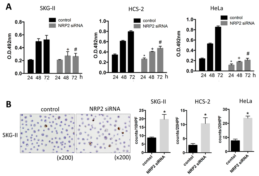 The effect of NRP2 on cell proliferation in SKG-II cells. (A) MTS assay in SKG-II, HCS-2 and HeLa cells. Cell proliferation was suppressed by transient transfection with NRP2 siRNA. (* p < 0.05 (24 h), + p < 0.05 (48 h), # p < 0.05 (72 h)); (B) TUNEL assay for SKG-II, HCS-2 and HeLa cells. The Y-axis shows the number of positive cell counts per 10 or 20 high-power fields (10 or 20 HPFs). Positive cells were induced by transfection of NRP2 siRNA (* p < 0.05).