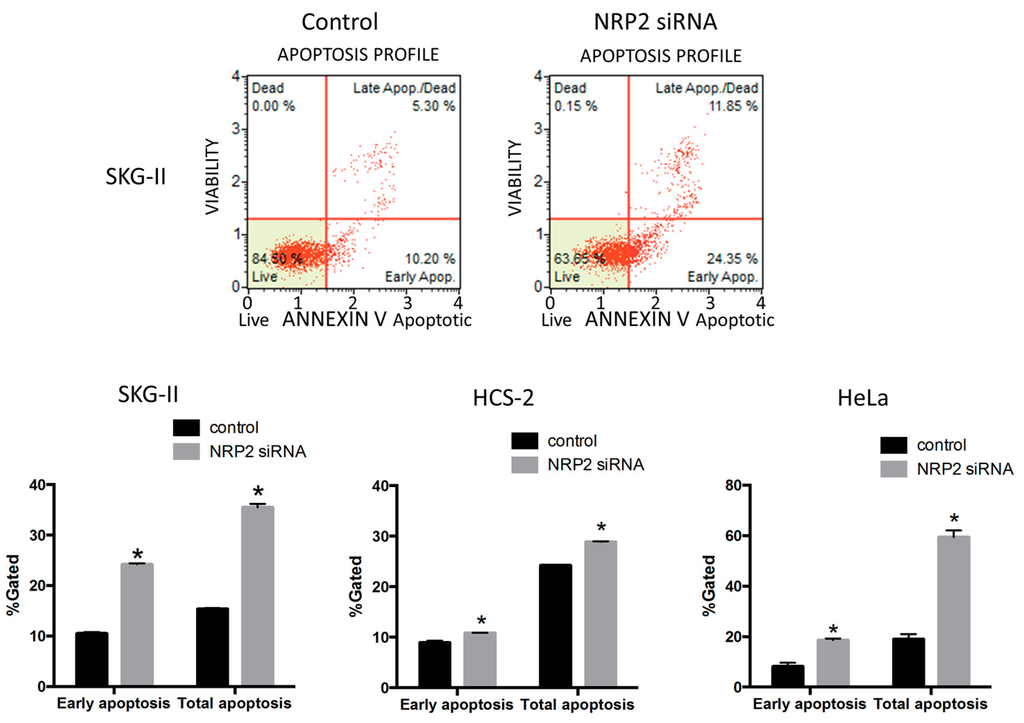 Annexin V assay for cervical cancer cells. Early and total apoptotic cells were significantly increased by NRP2 suppression in SKG-II, HCS-2 and HeLa cells (* p < 0.05).