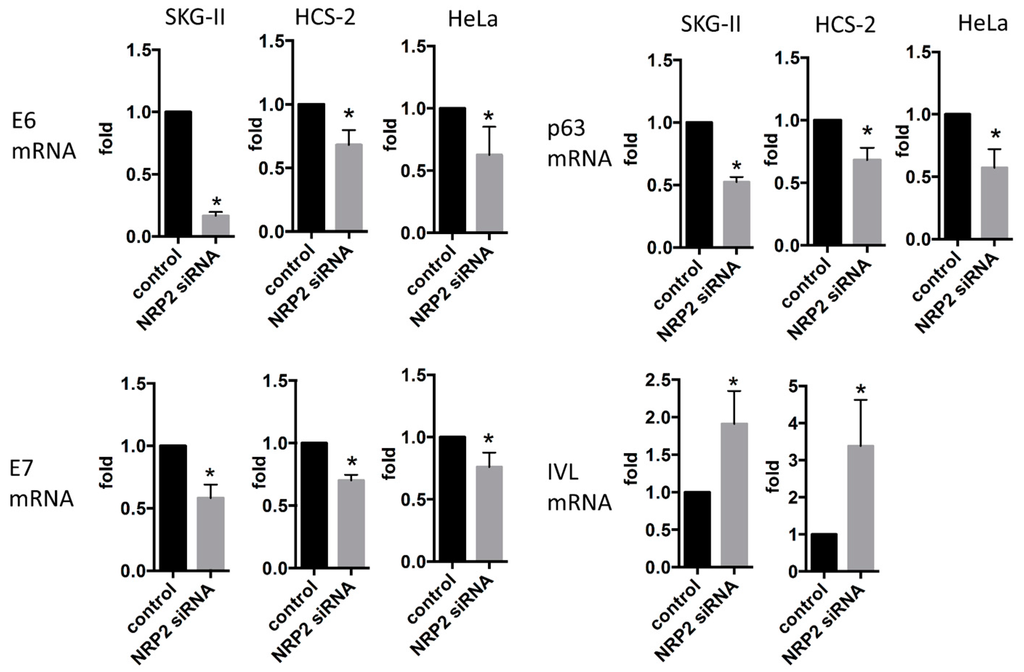 mRNA expression of HPV-related oncogenes, E6/E7 and keratinocyte related genes, p63 and IVL. E6/E7 and p63 mRNAs were significantly decreased by transient transfection with NRP2 siRNA. whereas IVL mRNA was significantly increased in SKG-II, HCS-2 cells transiently transfected with NRP2 siRNA (* p < 0.05).