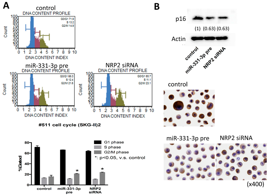 Cell cycle analysis in the SKG-II cells. Cell cycle analysis using the Muse™ Cell Analyzer (Millipore; Hayward, CA, USA). (A) The upper panels show the DNA content profile by transient transfection of with the miR-331-3p precursor (miR-331-3p pre) or NRP2 siRNA. The DNA histogram results show the distribution of the cell cycle phases; G0/G1 (blue), S (red) and G2/M (green). The lower panel shows the percentage of G1, S, or G2/M phase; (B) Western blotting (upper panel) and immunocytochemistory (lower panel) for p16INK4a (p16) protein expression in SKG-II cells.