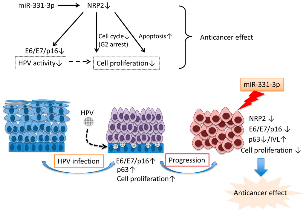 (Upper panel) miR-331-3p down-regulates NRP2, a putative direct target of miR-331-3p, and inhibits cell proliferation by regulating the expression of E6/E7, keratinocyte differentiation, cell cycle, and apoptosis in cervical cancer cells (thin black arrows); (Lower panel) HPV infection promotes cell proliferation through up-regulation of E6/E7, p16 and p63, and progression to cervical cancer (thin blue arrows). miR-331-3p acts as an anticancer factor through suppression of NRP2 (the thick blue arrow).