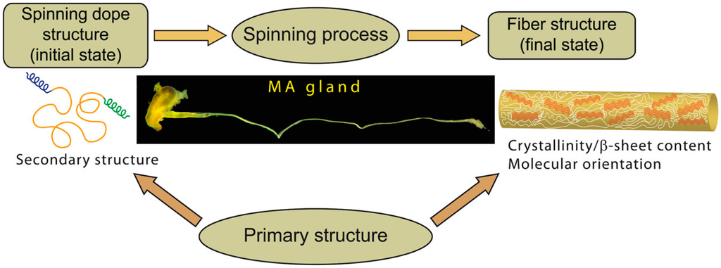 Schematics showing the relationships between the structure of major ampullate (MA) spidroins in the silk dope, the fiber structure, the spinning process and the primary structure. Silk formation corresponds to the transformation converting the spidroins in the dope (initial conformational state) into the silk fiber (final structural state). The spinning process (mechanical constraints applied, physicochemical environment) and primary structure (chemical composition) are the two factors that govern structural changes. On one hand, the spinning process triggers and induces conformational and orientational changes to the polypeptide chains. On the other hand, the response of spidroins and the final secondary structure they adopt are dictated by the sequence.