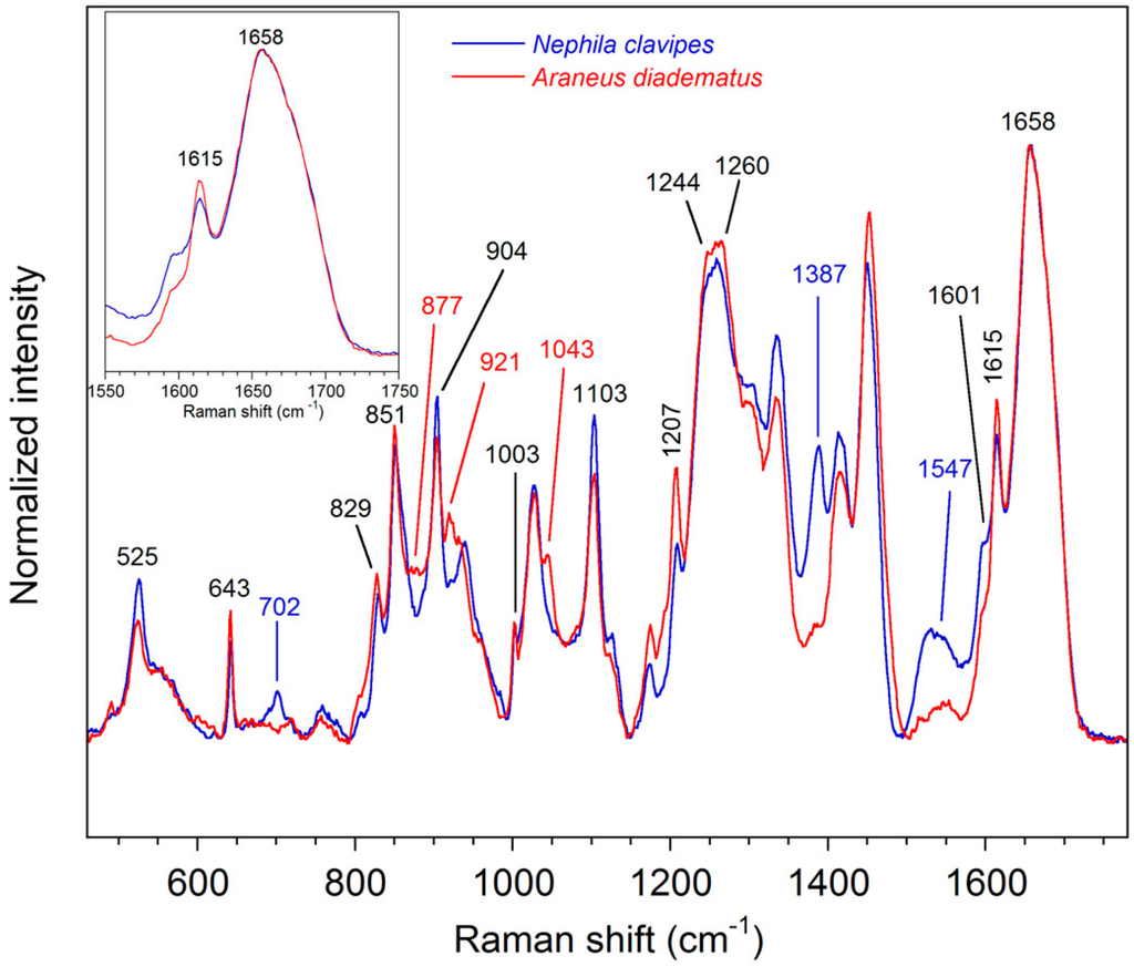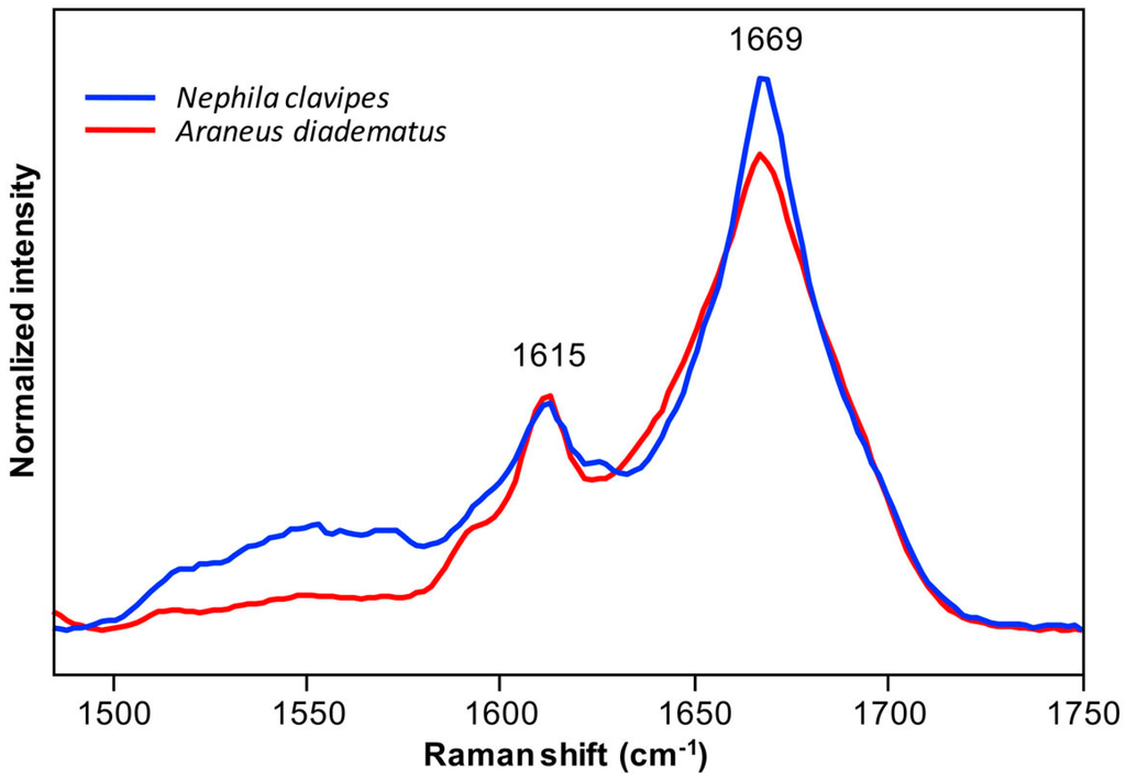 Raman spectra of the spinning dope contained in the sac of the Nephila clavipes (NC) and Araneus diadematus (AD) MA glands.