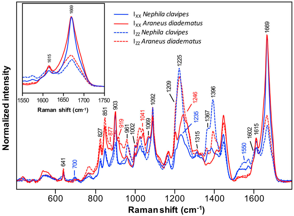 Polarized IXX and IZZ Raman spectra of Nephila clavipes and Araneus diadematus MA silk fibers. Spectra are normalized so that the IXX peak maximum is equal in the amide I region. They represent the mean spectra calculated over 12–14 series of measurements.