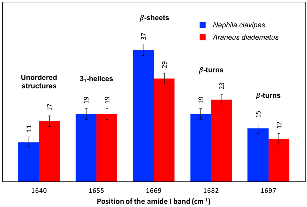 Relative band areas of the different amide I components of Nephila clavipes and Araneus diadematus fibers. The approximate error on the secondary structure content due to curve-fitting is ±3% and is represented by the error bars on the figure.