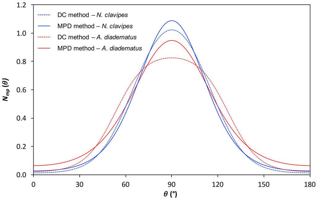 Most probable orientation distribution (MPD) functions, Nmp(), of the carbonyl groups as determined from the order parameter values (Table 1) of Nephila clavipes and Araneus diadematus MA silk fibers according to the MPD and depolarization constant (DC) methods.