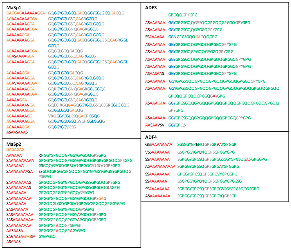 Amino acid sequences for the spidroins composing the MA gland silk of Araneus diadematus (ADF3 and ADF4) [23] and Nephila clavipes (MaSp1 and MaSp2) [21,22]. Single letter code for amino acids is used to simplify the analysis. The An, GA, GGX, and GPGXX motifs are inspired from those of Gatesy et al. [44] and are indicated in red, orange, blue, and green respectively, where X represents a small subset of amino acids (X = L, Q, T, S, etc.). Amino acids that have undergone substitution in the motifs are colored in black and those that do not contribute to any motifs are colored in grey.