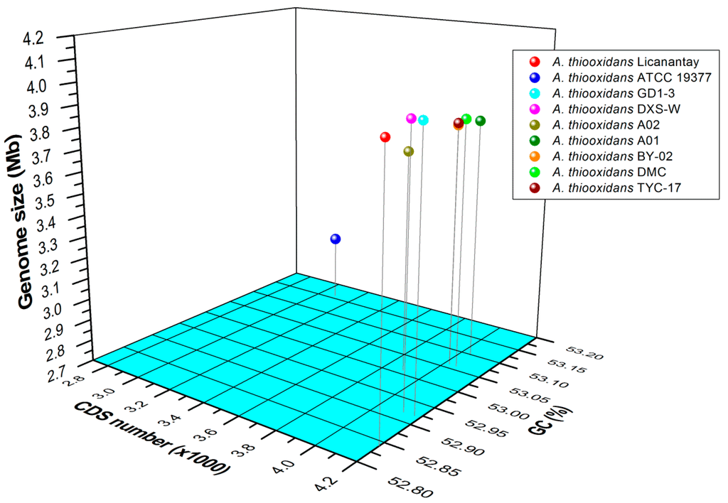 Three-dimensional plots of genome size, coding sequence (CDS) number, and GC content of the nine Acidithiobacillus thiooxidans (A. thiooxidans) strains sequenced in this study. The available genomes from strains Licanantay, ATCC 19377, and A01 were acquired from the public database, and the others were sequenced in this study.