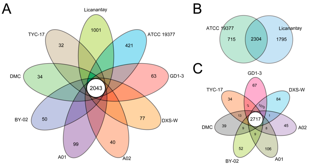 Considering the closely relation between Licanantay and ATCC 19377 [17], we further identified their shared genes. 2304 orthologous genes were present, and the unique genes in Licanantay and ATCC 19377 were 1795 and 715, respectively (Figure 2B), further indicating that Licanantay with much more strain-specific genes had the advantage to adapt the environmental conditions. Additionally, core orthologous genes and unique genes within seven other strains were examined. 2717 orthologs were identified, and the number of strain-specific genes in each strain varied from 34 to 106 (Figure 2C). In particular, GD1-3 and DXS-W shared a large number of genes (1070) only between the two of them, suggesting a closely correlation with each other.