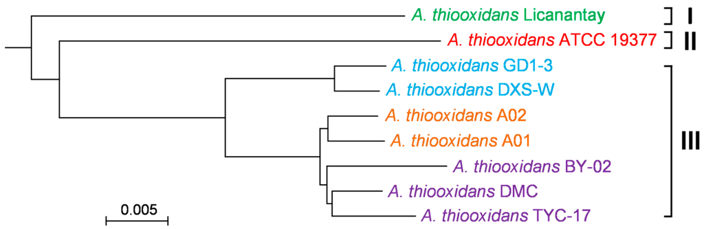 Since the 16S rRNA gene sequences among each pair of A. thiooxidans strains are highly similar, we could not assess the phylogenetic distance between strains using these sequences alone. In this study, a phylogenomic tree based on their core genome (Figure 3) showed that nine strains were apparently divided into three main groupings. As depicted in Figure 3, A. thiooxidans Licanantay was genetically distinct from other strains included in this study, and strains GD1-3, DXS-W, A02, A01, BY-02, DMC, and TYC-17 were closely related to each other. In fact, the strains ATCC 19377 and Licanantay were originally isolated from Kimmeridge clay and Chilean copper mine respectively [15,17], and the others from various acidic environments in China (Table 1). Thus, a hypothesis was proposed that hereditary difference might be related to the geographic distribution.