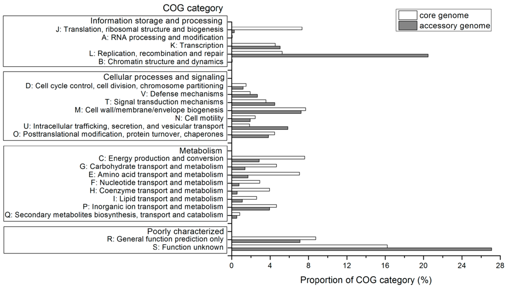 To identify possible intraspecific diversification in functions, the functional annotation of core genome and accessory genome were performed against the specialized database Clusters of Orthologous Groups (COG). As shown in Figure 4, the abundances of metabolism-related genes assigned to COG categories (C) (energy production and conversion), (E) (amino acid transport and metabolism), (G) (carbohydrate transport and metabolism), (F) (nucleotide transport and metabolism), (H) (coenzyme transport and metabolism) and (I) (lipid transport and metabolism) in the core genome were greater in these A. thiooxidans strains compared to those in the accessory genome. These findings were reasonable given that these shared genes were involved in microbial basic activities, which might support the view that core genome was essential for basic lifestyle of species [12,13]. Additionally, the core genome was highly enriched in COG category (J) (translation, ribosomal structure and biogenesis) relative to accessory genome. These features were similar to what other researchers have been found in their respective pan-genome analyses [21,22]. Especially, the core genome in all strains was commonly enriched in the COG category (M) (cell wall/membrane/envelope biogenesis). We interpreted this as an indication that A. thiooxidans strains inhabiting the acidic environments shared distinctive structural and functional properties to maintain a stable pH gradient, as specialized cellular structures were regarded to be important for acidophile pH homeostasis [23].