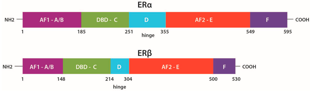 Functional domains of estrogen receptors (ERα and ERβ). Receptor domains are indicated in different colors: Purple, activation factor 1 (AF1) domains A/B; green, DNA-binding domain (DBD) C; blue, heat shock proteins binding domain D; red, activation factor 2 (AF2) domain E; dark purple, C-terminal domain F. Modified from Ng et al. [].