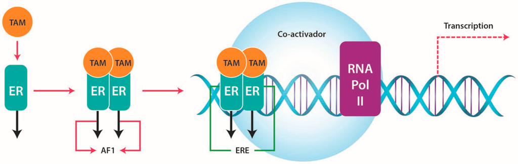 TAM binds to ER with lower affinity compared with E2, and dissociates the heat shock protein 90 (HSP90). The TAM-ER complex homo or hetero dimerizes and translocates to the cell nucleus, causing the activation of the activation factor 1 (AF1) domain and inhibiting the activation factor 2 (AF2) domain. Following this, the TAM-ER dimer binds to DNA at palindromic ERE sequences in the promoter region of E2 responsive genes. Transcription of the E2 responsive gene(s) is attenuated because the AF2, ligand-dependent domain is inactive, and ER co-activator binding is reduced by the TAM-ER complex; partial agonist activity results from the AF1 domain, which remains active in the TAM-ER complex [] (Figure 2).