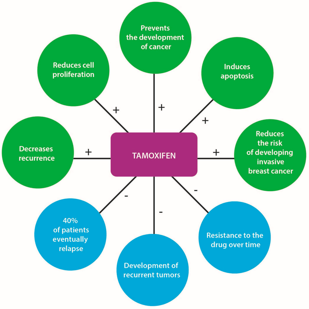 TAM was demonstrated to reduce the risk of developing ERα-positive breast cancer by at least 50%, in both pre- and post-menopausal women []. The use of this anti-estrogen agent (dose of 20 mg/day) reduces the occurrence of breast cancer by 38% in healthy women at high risk of acquiring the disease, decreases the likelihood of recurrence in early breast cancer cases, prevents the development of cancer in the opposite breast, reduces cell proliferation, induces apoptosis and reduces the risk of developing invasive breast cancer in women with Ductal Carcinoma In Situ (DCIS) [,] (Figure 3). Five years of TAM treatment prevents ERα-positive breast cancer not only during this time period but also after treatment cessation. Recent studies have found that extending the duration of TAM treatment to 10 years further reduces the risk of breast cancer recurrence in ERα-positive cases [,].