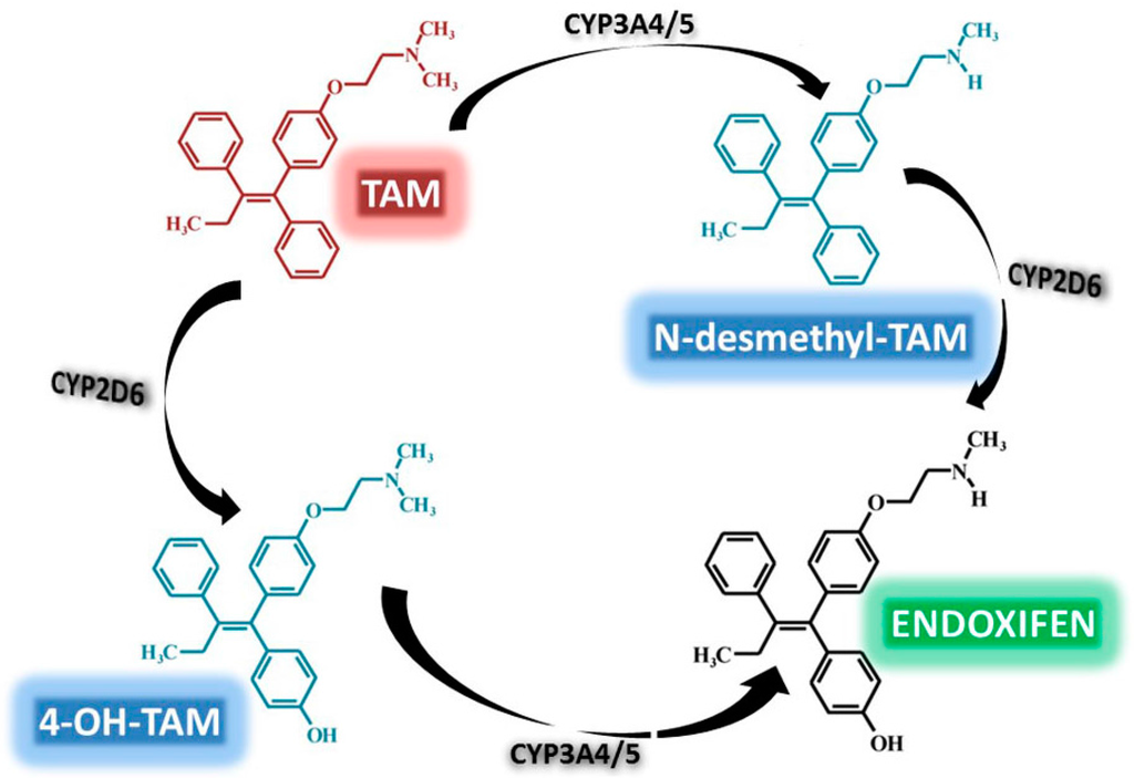 TAM metabolism. TAM is extensively metabolized through biochemical reactions mainly catalyzed by the cytochrome P450 family of enzymes (CYP3A4/5, CYP2D6). Based on Stearns et al. [].