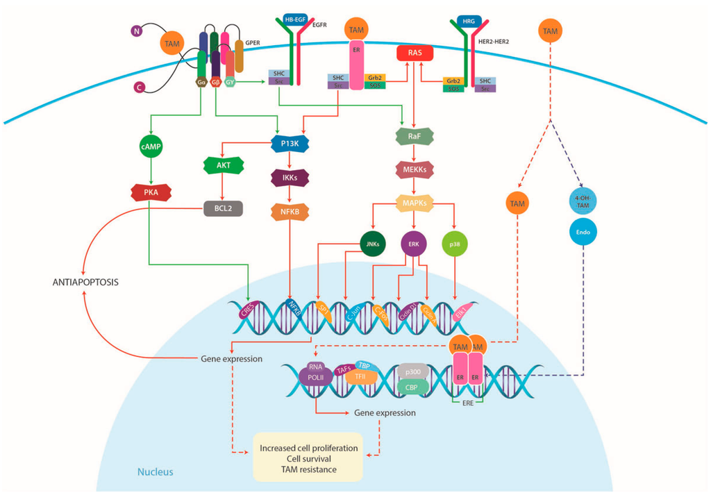 Besides this classical mechanism, a non-genomic effect mediated by membrane-associated ERα and ERβ has also been observed, leading to the activation of the cytoplasmic tyrosine kinase Src and other signaling molecules including: (i) IGF1R and EGFR; (ii) mitogen-activated protein kinases (MAPK), phosphatidyl inositol 3 kinase (PI3K) and AKT; (iii) protein kinase C (PKC) and cyclic AMP (cAMP); (iv) p21 and (v) pathways that promote the release of intracellular calcium [,,,,]. These signaling cascades can phosphorylate nuclear ERs and their co-activators (AIB1/SRC-3) resulting in their activation as transcriptional regulators of target genes []. In addition, the G protein-coupled estrogen receptor (GPER) is another candidate molecule involved in the non-genomic signaling mediated by E2 [] and also implicated in TAM resistance [,,,].