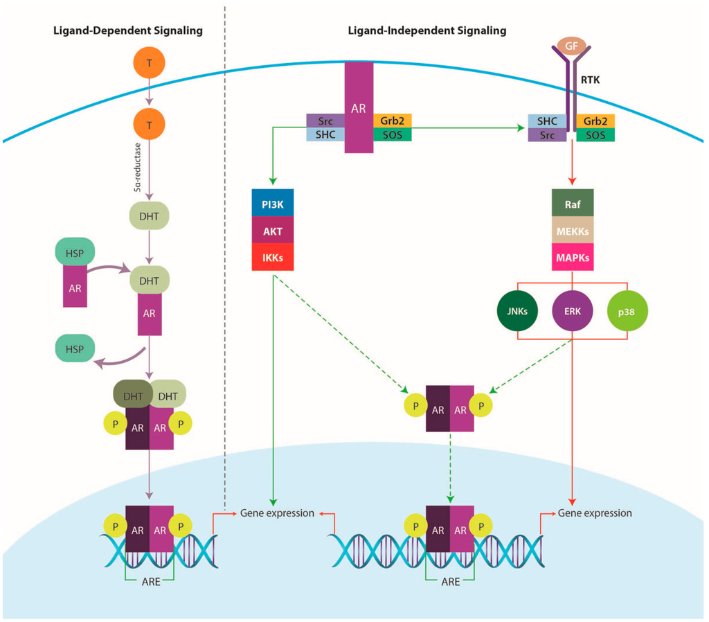 Androgen receptor (AR) signaling pathway. Ligand dependent and independent mechanisms. T: testosterone; DHT: 5-α dihydrotestosterone; HSP: heat shock protein; GF: growth factors; RTK: receptor tyrosine kinase.