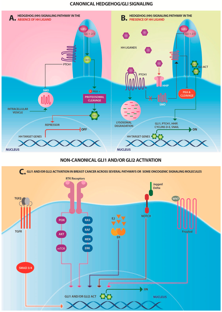 Simplified representation of canonical and non-canonical Hedgehog(HH) signaling. Canonical activation of the HH pathway. (A) In the absence of HH ligand, PTCH1 present in the primary cilium prevents Smoothened (SMO) trafficking and localization to the cilia. GLI mediators are in complex with proteins, including protein kinase A (PKA) and suppressor of fused homolog (SUFU), and generate repressor GLI forms, which translocate to the nucleus and inhibit transcription of HH signaling target genes; (B) In the presence of HH ligand, ligand binding to PTCH1 leads to PTCH1 internalization and degradation, SMO can traffic to the cilium and initiate a signaling cascade that processes the GLI proteins into transcriptional activator forms, which translocate to the nucleus and activate the expression of HH signaling target genes; (C) Activation of GLI1 and GLI2 in breast cancer by non-canonical pathways. Regulatory signaling cascades or regulatory proteins other than canonical Hedgehog signaling can modulate GLI1 and GLI2 expression, transcriptional activity and stability. Transforming growth factor β/transforming growth factor receptor (TGFβ/TGFR) signals can induce transcriptional up-regulation of GLI1 and GLI2 via SMAD. Receptor tyrosine kinases (RTK) signals via the PI3K-AKT signaling cascade can induce stabilization of the GLI1 protein. In ERα-positive breast cancer cells E2 induces expression of SHH and GLI1 independent of SMO activity. WNT signaling activation stimulates GLI2. GLI2 ACT, the activator form of GLI2.