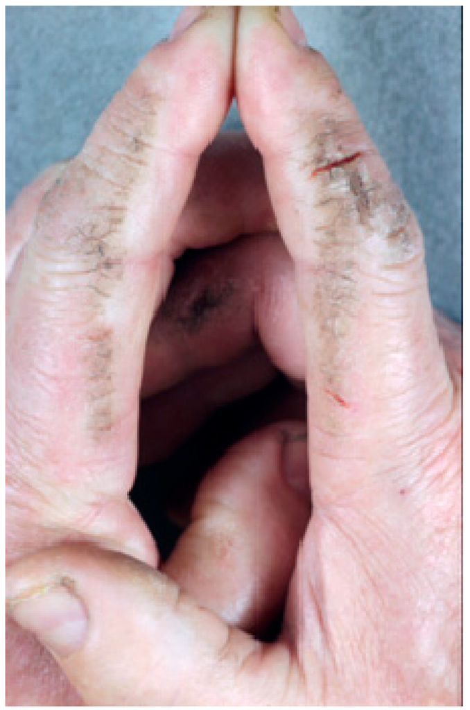 We detected psoriasis-related skin conditions in a total of 14 out of 610 patients (2.3%). In all cases, diagnosis was made before the onset of the renal failure. Psoriasis in renal transplant recipients was characterized by a minimal skin involvement (Psoriasis Area Severity Index—PASI score < 3) (Figure 1) and did not require active treatment in addition to the on-going immunosuppressive treatment. The only added treatment was the use of topical emollients in about 30% of cases.