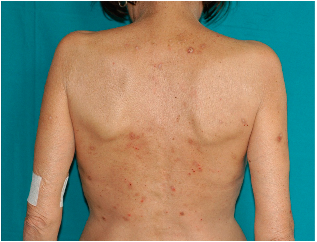 Patients with chronic renal insufficiency often suffer from pathological conditions such as skin dryness, alopecia, skin discoloration, hair and nail abnormalities, as well as cutaneous diseases specifically related to kidney failure [1,2,3,4]. Usually, in the months immediately following transplantation, there is a progressive regression of these conditions, with a clinical and histopathological normalization of the skin [5]. However, other cutaneous diseases may progressively develop, which afflict more than half of renal transplant recipients, including infections to different body districts and non-melanoma skin cancers; these side effects are iatrogenic and develop as a consequence of the long-term immunosuppressive treatment. Notably, inflammatory diseases of the skin are rarely reported [6], possible as a consequence of the direct therapeutic effect of immunosuppressive therapy on these diseases. In the most recent Oxford series of kidney transplant recipients [6], the prevalence of psoriasis and atopic dermatitis was very low, around 1.5%, as also reported in other case series [7,8]. This is not surprising, since cyclosporine is commonly used in the treatment of psoriasis and other inflammatory dermatoses [9], while tacrolimus and mycofenolate are currently proposed for the treatment of atopic dermatitis [10].