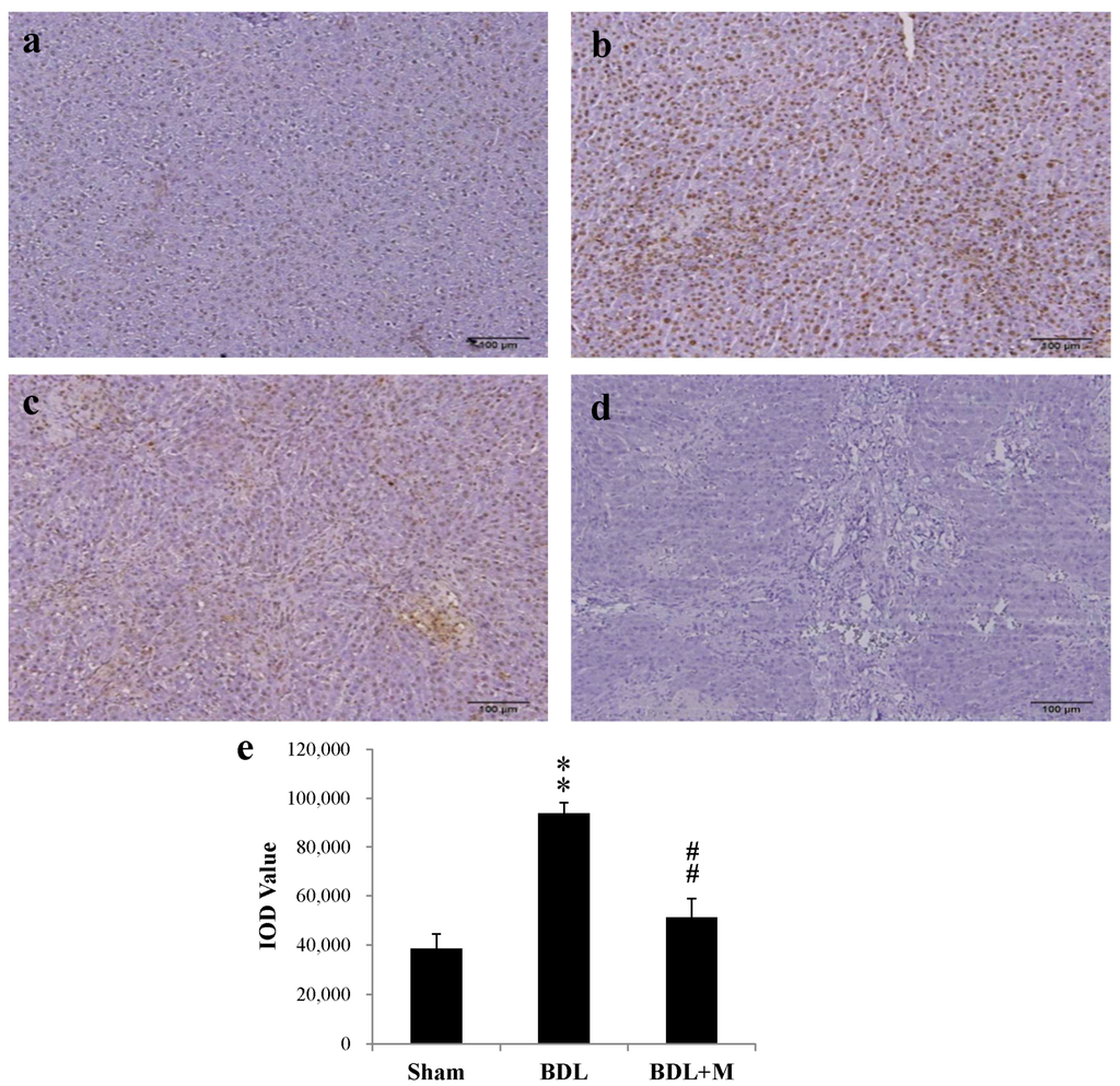 Representative Terminal deoxynucleotidyl transferase dUTP nick end labeling (TUNEL) staining of liver in bile duct ligation (BDL) rats without and with melatonin treatment. TUNEL staining was increased in BDL rat and this was significantly reduced by melatonin treatment: (a) Sham; (b) BDL; (c) BDL + M; (d) negative control; and (e) integrated optical density (IOD) value of TUNEL stain. Data are shown as mean ± standard error of mean (SEM). ** p < 0.01 vs. Sham; ## p < 0.01 vs. BDL.