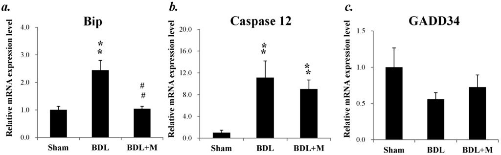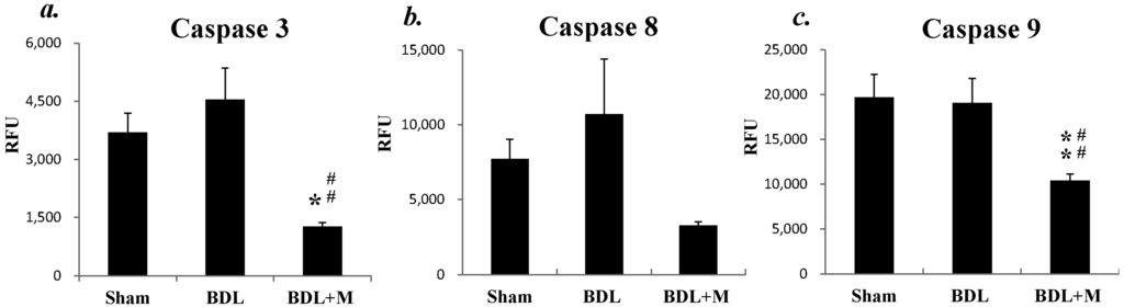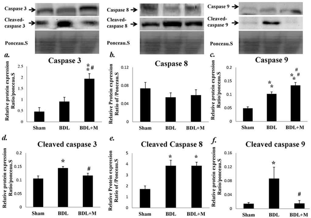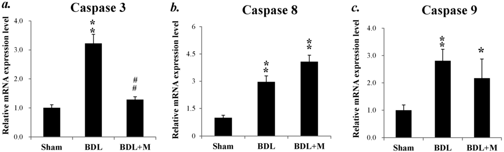 mRNA expression of caspase 3, 8 and 9: (a) expression of caspase 3 mRNA was increased in BDL group and down-regulated in BDL + M group; (b) BDL group had higher caspase 8 mRNA than Sham group; and (c) caspase 9 mRNA was increased in BDL and BDL + M groups. Significant difference among three groups was analyzed by one-way ANOVA followed by Bonferroni post hoc. All data are shown as mean ± SEM. * p < 0.05 vs. Sham; ** p < 0.01 vs. Sham; ## p < 0.01 vs. BDL.