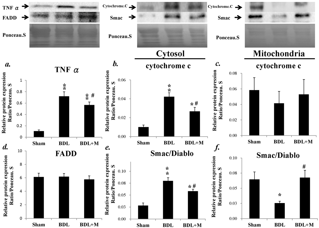 (a) BDL for two weeks increased TNF-α protein expression while melatonin treatment reduced this effect; (b) cytosolic cytochrome c was highly expressed in response to BDL and melatonin treatment rescued this process; (c) mitochondrial cytochrome c was decreased in response to BDL; (d) Fas-Associated protein with Death Domain (FADD) was not affected by BDL or melatonin treatment; (e) cytosolic second mitochondria-derived activator of caspase/direct inhibitor of apoptosis-binding protein with low pl (Smac/Diablo) was increased after BDL and melatonin effectively reversed the effect; and (f) mitochondrial Smac/Diabo change was not reversed by melatonin treatment. Significant difference among three groups was analyzed by one-way ANOVA followed by Bonferroni post hoc. All data are shown as mean ± SEM. * p < 0.05 vs. Sham; ** p < 0.01 vs. BDL; # p < 0.05 vs. BDL.