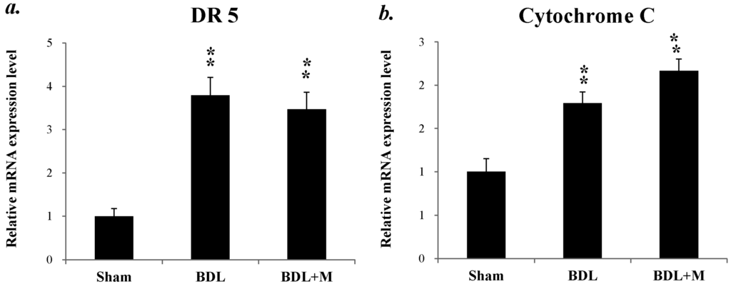 (a) BDL and melatonin treatment induced the up-regulation of TNF-Related Apoptosis-Inducing Ligand Receptor 2/death receptor 5 (TRAIL-R2/DR 5) and melatonin treatment showed no effect on it; (b) BDL increased cytochrome c mRNA expression and melatonin treatment showed no effect on it. Significant difference among three groups was analyzed by one-way ANOVA followed by Bonferroni post hoc. All data are shown as mean ± SEM. ** p < 0.01 vs. BDL.