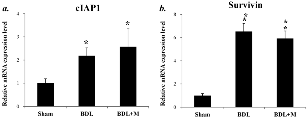mRNA expression of anti-apoptosis factors. Cellular inhibitor of apoptosis (cIAP1) (a) and survivin mRNA (b) were increased in BDL rats. Significant difference among three groups was analyzed by one-way ANOVA followed by Bonferroni post hoc. All data are shown as mean ± SEM. * p < 0.05 vs. Sham; ** p < 0.01 vs. Sham.