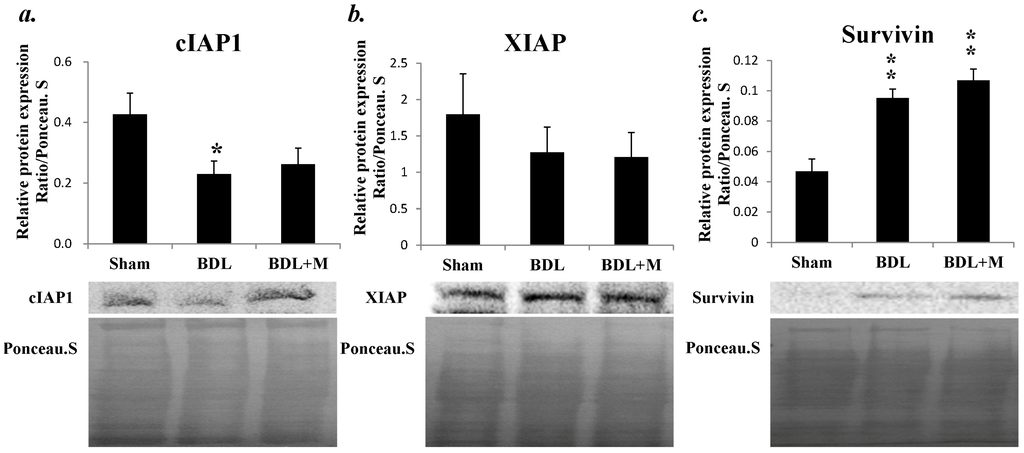 (a) Western blot revealed decreased level of cIAP1 in BDL rats; (b) both BDL and melatonin treatment did not alter the X-linked inhibitor of apoptosis protein (XIAP) expression; and (c) survivin was increased in BDL and BDL + M groups. Significant difference among three groups was analyzed by one-way ANOVA followed by Bonferroni post hoc. All data are shown as mean ± SEM. * p < 0.05 vs. Sham; ** p < 0.01 vs. Sham.