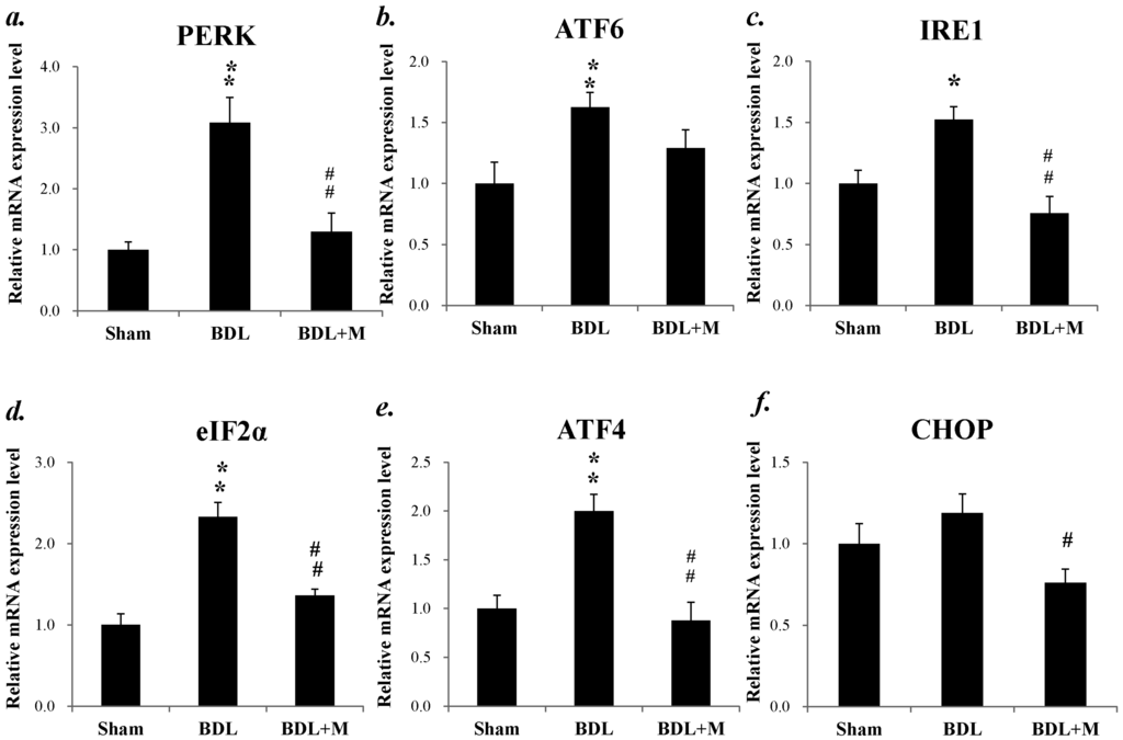 (a) Increased mRNA expression of protein kinase RNA-like endoplasmic reticulum kinase (PERK) in BDL rats and responded well to melatonin treatment; (b) increased activating transcription factor 6 (ATF6) mRNA expression in BDL rats; (c) increased inositol-requiring enzyme 1 (IRE1) mRNA expression and responded to melatonin treatment; (d) increased eukaryotic translation initiation factor 2α (eIF2α) mRNA expression and responded to melatonin treatment; (e) increased activating transcription factor 4 (ATF4) mRNA expression and responded to melatonin treatment; and (f) BDL + M group had lower CCAAT-enhancer-binding protein homologous protein (CHOP) mRNA expression than BDL group rats. Significant difference among three groups was analyzed by one-way ANOVA followed by Bonferroni post hoc. All data are shown as mean ± SEM. * p < 0.05 vs. Sham; ** p < 0.01 vs. Sham, # p < 0.05 vs. BDL; ## p < 0.01 vs. BDL.