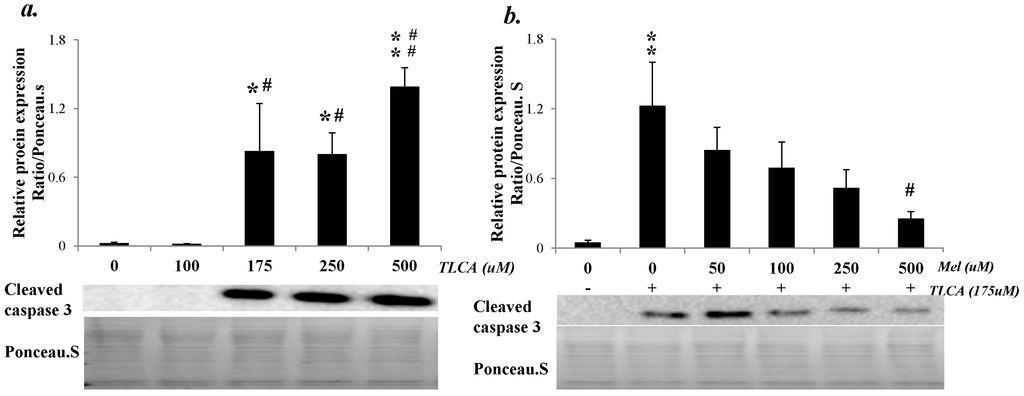 It has been known that melatonin exerts its effect through melatonin (MT) receptor []. Three subtypes of melatonin receptors were identified in animals, MT1, MT2, and MT3 receptors [], while only MT1 and MT2 but not MT3 receptors were found [,] in mammals. In the present study, we used melatonin receptor antagonists, luzindole (MT1 antagonist) and 4P-PDOT (MT2 antagonist), to evaluate whether melatonin acted through MT1 or MT2 receptor and found that the increased cleaved caspase 3 expression was in a taurolithocholic acid (TLCA) dose-dependent manner. Besides, melatonin effectively decreased the cleaved caspase 3 expression in a dose-dependent fashion. Furthermore, melatonin reduced cleaved caspase 3 expression in HepG2 cells incubated with 4P-PDOT, suggesting that melatonin acted through MT2 receptor.