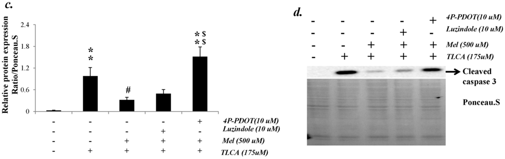 There are three subtypes of melatonin receptors identified: MT1, MT2, and MT3 [,]. In mammals, the effects of melatonin are mediated mainly through MT1 and MT2 receptors. MT1 receptor is inhibited primarily by luzindole and MT2 receptor is inhibited primarily by 4-phenyl-2-propionamidotetralin (4P-PDOT). Therefore, we focused on MT1 and MT2 receptors for delineating the pathway that mediates the work of melatonin on liver apoptosis. As shown in Figure 12, there was a taurolithocholic acid (TLCA) dose-dependent expression of cleaved caspase 3 at six hours of incubation (F (4, 31) = 11.031, p < 0.001) (Figure 12a). Besides, melatonin effectively decreased the cleaved caspase 3 expression in a dose-dependent fashion (F (5, 34) = 4.206, p = 0.003) (Figure 12b). Furthermore, incubation the cells with 4P-PDOT showed melatonin reduced cleaved caspase 3 expression through MT2 receptor (F (4, 30) = 14.167, p < 0.001) (Figure 12c). The above findings indicated that melatonin acted in a caspase-dependent apoptosis and worked through the MT2 receptor.