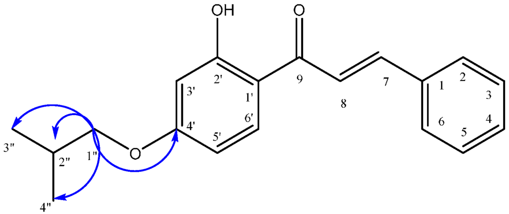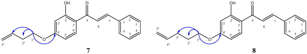 For unsaturated compounds 7 and 8, the proton signal at 4.08 ppm (t, 2H) ascribed to O–CH2 protons of alkoxy chain linking (E)-chalcone ring is also observed. For compounds 7–8, the correlation between the signal at 166.7 ppm with the 1H NMR signal cited above allows the assignment of this signal to the O–CH2 carbon. However, the difference between 7 and 8 was HMBC correlations between H-1″ and C-3″, where H-1″ showed heteronuclear 3J correlations with C-3″ at δ 133.9 and 28.1 ppm, respectively (Figure 3).
