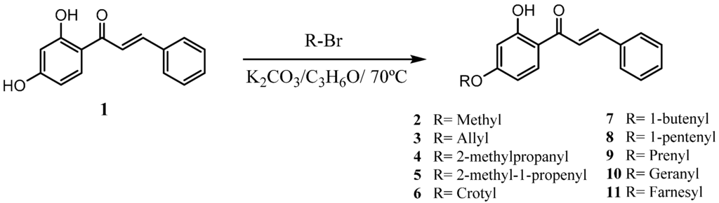 All of the O-alkylated chalcones 2–11 were synthesized according to previous literature, i.e., via reaction of 2′,4′-dihydroxychalcone (isolated naturally from Adesmia balsamica) with each desired alkyl bromide in the presence of potassium carbonate and acetone (Scheme 1) [12].