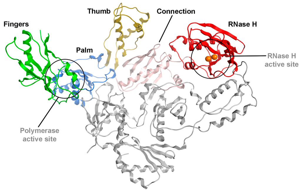 Overall view of the full HIV-1 RT heterodimer. Subunits p51 (grey) and p66 (which include fingers, palm, thumb, connection, and RNase H sites) are depicted as ribbon. Polymerase and RNase H active sites are circled in black. The RNase H metal cofactors are represented as orange spheres.