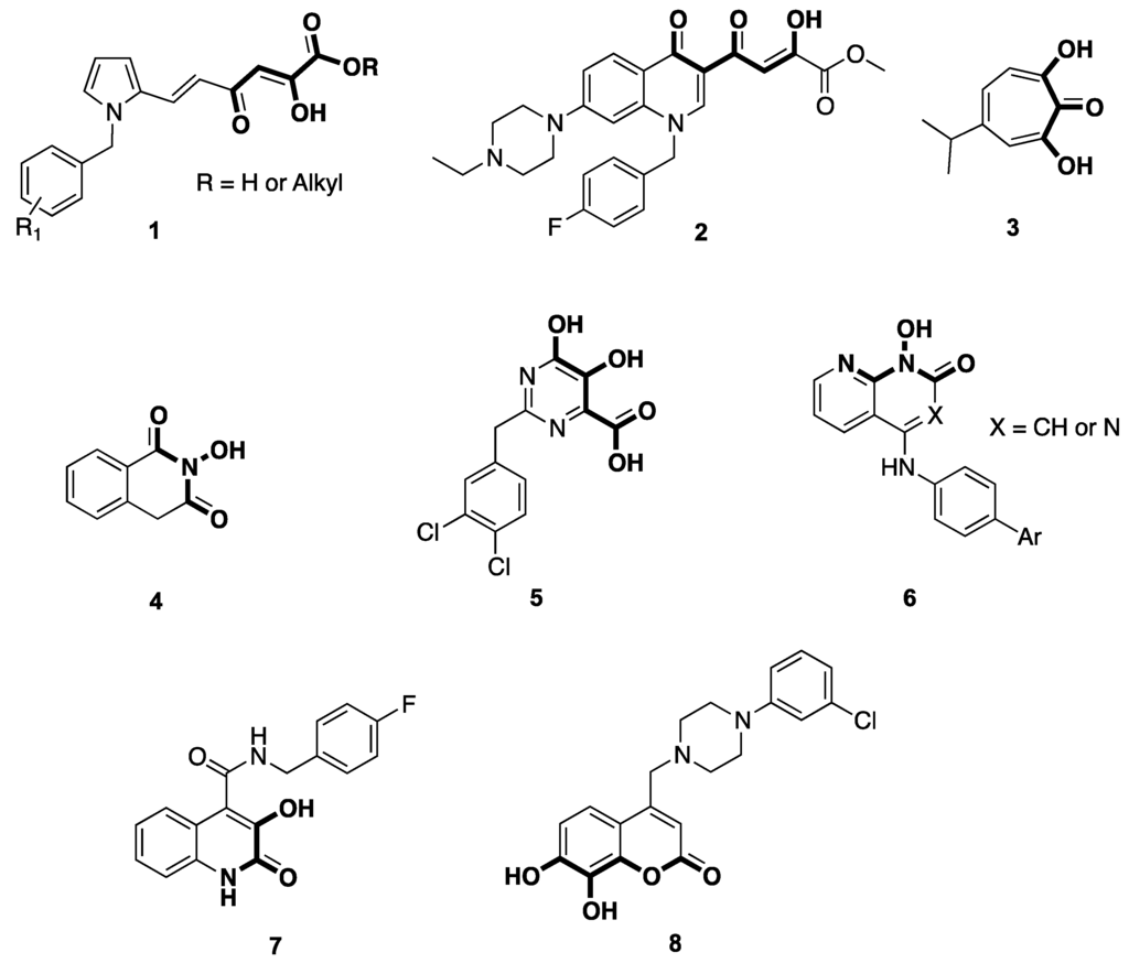 As demonstrated for other polynucleotidyl transferases, HIV-1 RNase H can also be inhibited through selective chelation of the metal cofactors [12]. During the last years, a few classes of compounds capable of inhibiting HIV-1 RNase H activity by involving such a mechanism have been identified (Figure 2), and include diketoacids/esters (1) [13,14,15,16], triketoacids (2) [17], β-thujaplicinol (3) [18], 2-hydroxyisoquinoline-1,3(2H,4H)-diones (HID, 4) [19], pymidinol carboxylic acids (5) [20], naphthyridinones (5,6) [21,22], 3-hydroxy-2-oxo-1,2-dihydroquinoline-4-carboxamides (7) [23], and 4-(aryl)piperazin-1-yl)methyl)-7,8-dihydroxy-2H-chromen-2-ones (8) [24]. All these compounds share a common pharmacophoric pattern constituted by at least three metal chelating features, which usually consist of three oxygen atoms (compounds 1–5, and 8). In other examples, as outlined by compounds 6 and 7, the minimal pharmacophore is formed by the combination of two oxygen atoms and one nitrogen atom. However, neither of these compounds is currently moving into advanced preclinical development.