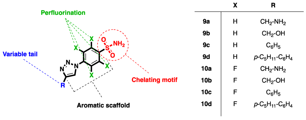 In order to study the influence of perfluorination on the activity of homologous compounds, we re-synthesized two subclasses of derivatives (Scheme S1), where the first bears a simple benzenesulfonamide scaffold (9a–d), while the second one carries a 2,3,5,6-tetrafluorobenzenesulfonamide group (10a–d).