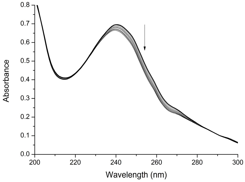 Since RNase H active site inhibitors have been reported to chelate the Mg2+ ions [12,13,14,15,16,17,18,19,20,21,22,23,24], and to support the hypothesis that the sulfonamide group could interact with the metal cofactors in the RNase H catalytic pocket, we measured the capability of the model compound 10d to coordinate Mg2+ ions by means of UV-visible (UV-vis) experiments. A series of UV-vis absorbance spectra of a methanolic solution of 10d in the presence of increasing equivalents of Mg(CH3COO)2 were recorded (Figure 4). We observed that increasing concentrations of Mg2+ produced a reduction of the maximum UV-vis absorption, supporting the involvement of coordinative interactions between the sulfonamide and metal ions.