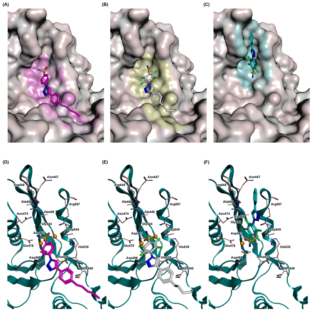 Predicted binding modes for the most active compounds 9d, 10c, and 10d within the HIV-1 RNase H catalytic site: (A–C) best docking pose for 9d (purple), 10c (cyan), and 10d (white), respectively, with the protein shown as grey surface, and with the contact residues colored in the same color as the docked ligand; (D–F) close views of the binding site, where the protein is depicted as cartoon (blue lagoon), side chains of relevant residues are provided as thick line (pink), and Mn2+ metal cofactors as spheres (orange).