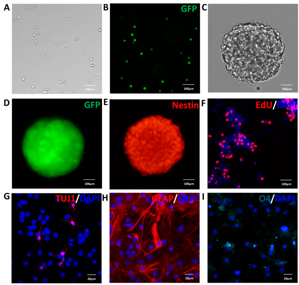 Characterization of neural stem cells (NSCs) from the GFP transgenic mouse in vitro. Mouse NSCs were cultured in growth medium supplemented with 20 ng/mL EGF and 10 ng/mL bFGF. However, to observe the differentiation ability of NSCs, bFGF and EGF were removed, and 1% fetal bovine serum was added into the medium. (A) The phase of dissociated NSCs; (B) the dissociated NSCs expressed GFP (green); (C) the phase of neurosphere; (D) neurosphere-expressed GFP (green); (E) neurosphere-expressed nestin (red); (F) the proliferation of NSCs was determined by cell labeling with 5-ethynyl-2’-deoxyuridine (EdU) (red); (G) immunofluorescent staining of the neuronal marker Tuj1 (red); (H) the astroglial marker GFAP (red); (I) the oligodendrocyte marker O4 (cyan). Nuclei in (F–I) were stained with DAPI (blue). Scale bar: 100 μm (A–F); and 20 μm (G–I).