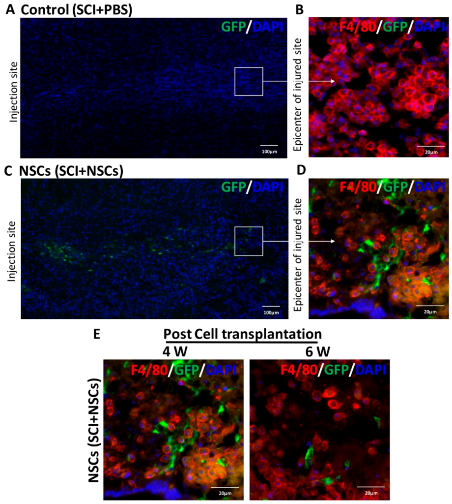 Four weeks after transplantation, the migration and distribution of grafted NSCs with green fluorescent protein (GFP) in the injured spinal cord was observed by longitudinal section. Compared to the control group (Figure 2A,B), cells with the GFP signal were found in the area between the implantation site and injured area four weeks after NSC transplantation (Figure 2C). It has been reported that bone marrow-derived macrophages (BMDMs) could migrate to the injured site about three days after the injury and then accumulate at the epicenter of damaged spinal cord [21]. Therefore, the epicenter of the injured area was identified with many F4/80+ cells having a round cell morphology. As shown in Figure 2D, GFP-NSCs arrived at the lesion epicenter, while there were only F4/80-positive cells without GFP-positive cells within the epicenter of the injury area in the control group (Figure 2B). Then, compared to four weeks after NSC transplantation, the number of NSCs within the injured area was significantly decreased at six weeks post-transplantation (Figure 2E). Therefore, these results suggested that grafted NSCs can survive and migrate toward the injured area.