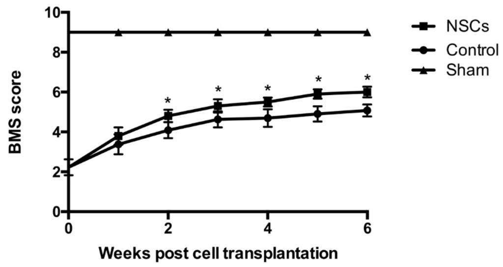 Basso Mouse Scale (BMS) scores were performed at Weeks 1, 2, 3, 4, 5 and 6 post-transplantation to evaluate hindlimb locomotor function. As shown in Figure 3, there was no significant difference of the BMS scores between the control group and the NSC transplantation group at Week 1 post-transplantation (p > 0.05; Figure 3). However, BMS scores of the NSC transplantation group were significantly increased compared to the control group from Week 2 to Week 6 post-transplantation (ANVOA, p < 0.05; Figure 3). Therefore, our results showed that grafted NSCs can facilitate motor function recovery following SCI.