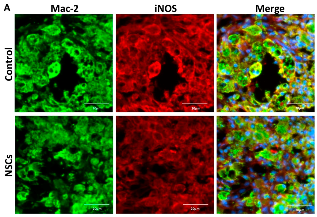 NSC transplantation inhibited macrophages’ activation after spinal cord injury. One week post-transplantation, the injured site was double-stained for iNOS and Mac-2 via immunofluorescent staining. (A) Representative images of spinal cord sections immunostained for iNOS (red) and Mac-2 (green) at the injury epicenter; (B) quantitative analysis of iNOS and Mac-2 double-positive cells by ImageJ (n = 5). Results are displayed as the mean ± standard error. * p < 0.05. Scale bar: 20 μm.