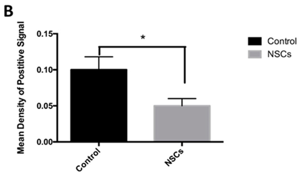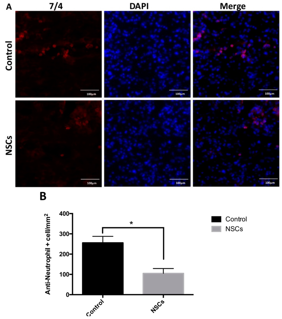 Furthermore, the number of neutrophils (control group: 256 ± 32 cells/mm2, NSC transplantation group: 105 ± 10 cells/mm2) was significantly decreased one week post-transplantation in the NSC group compared to the control group (p < 0.05) (Figure 5).