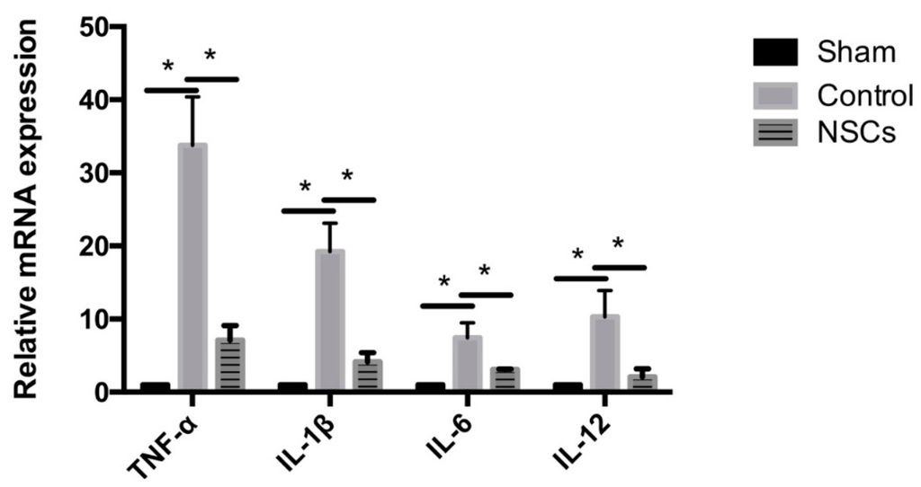 Next, the expression of tumor necrosis factor-α (TNF-α), interleukin-1β (IL-1β), interleukin-6 (IL-6) and interleukin-10 (IL-10) mRNA in the injured spinal cord tissue of each experimental group was evaluated by using quantitative real-time PCR to determine the effects of NSC transplantation on the expression of inflammatory cytokines in the SCI at three days after transplantation. The results showed that the levels of TNF-α, IL-1β, IL-6 and IL-12 mRNA were significantly higher in the control group than the mRNA levels of the sham group (p < 0.05; Figure 6). Compared to the control group, the mRNA levels of TNF-α, IL-1β, IL-6 and IL-12 were significantly decreased in NSC-treated animals (p < 0.05; Figure 6).